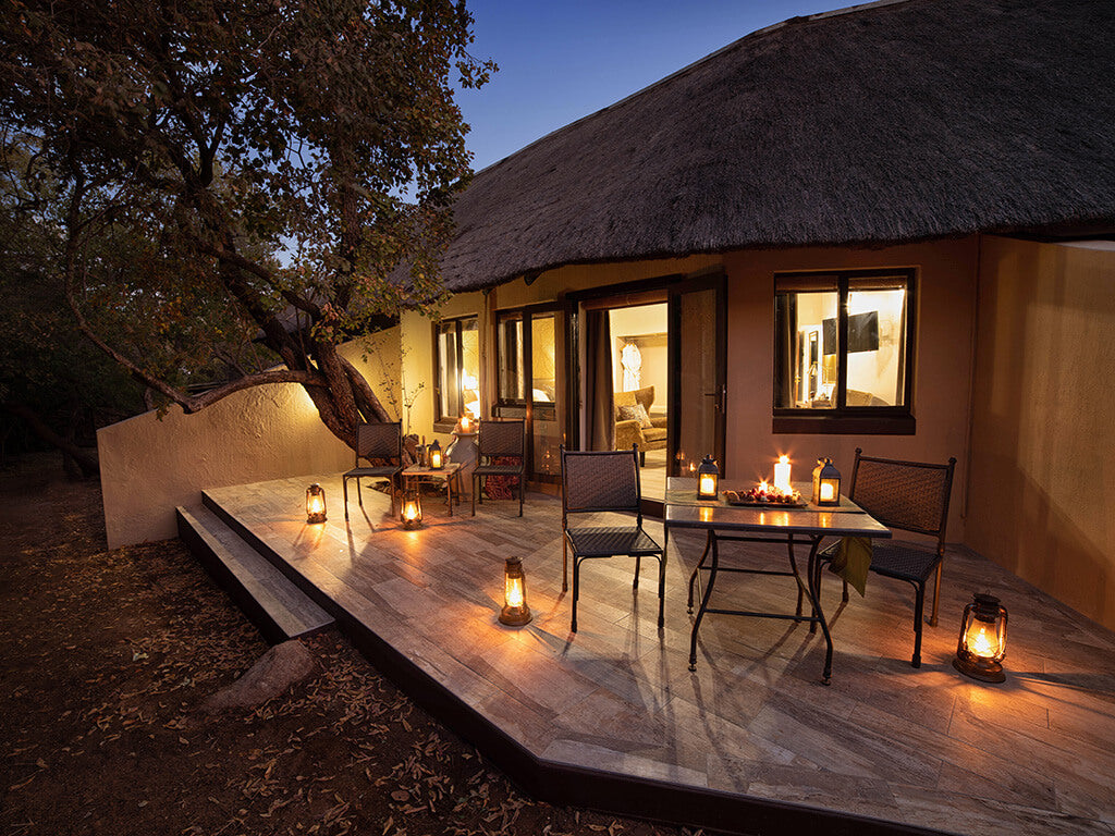 - Thatched-roof luxury suites with bushveld views and modern comforts